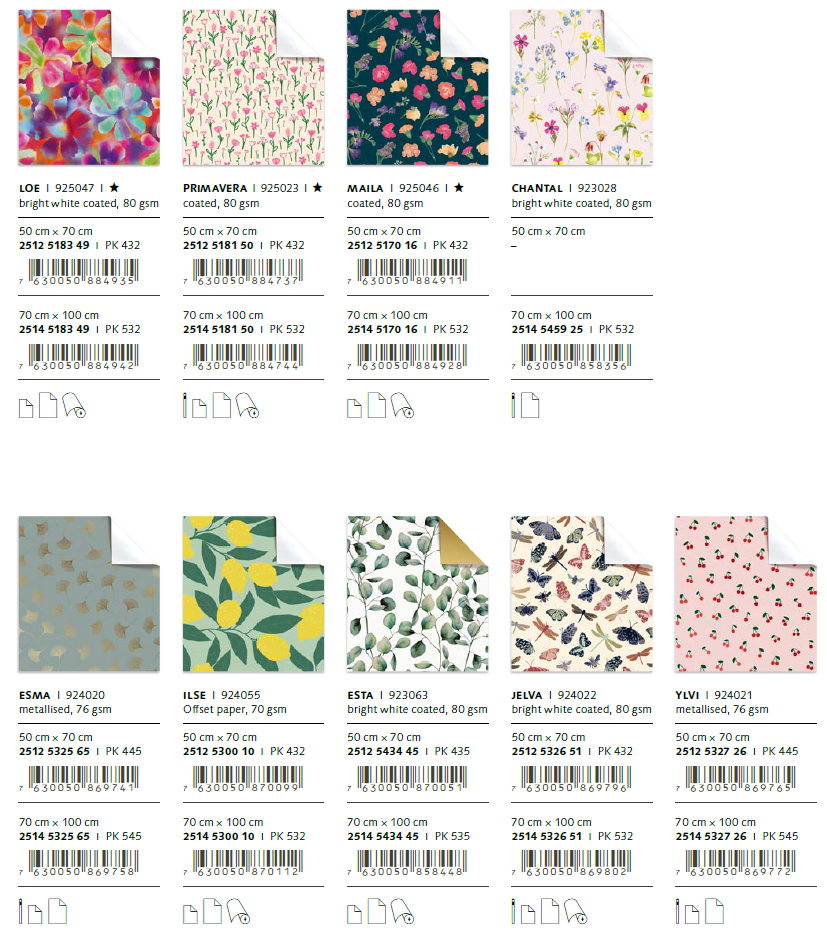 Geschenkpapier in Bogen gibt es in 2 verschiedenen Formaten: 50 x 70 cm oder 70 x100 cm. Falls kleinere Bögen benötigt werden, können diese mit einem kleinen Zuschlag (Schneidekosten) auf die gewünschte Grösse zugeschnitten werden.