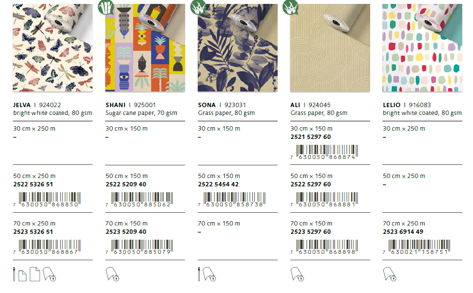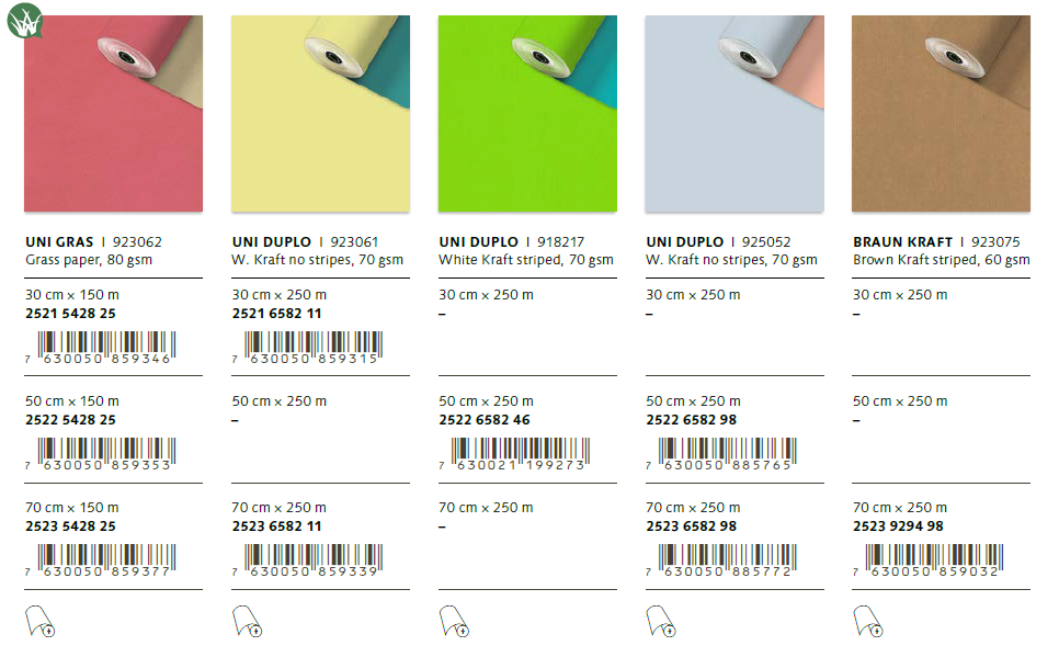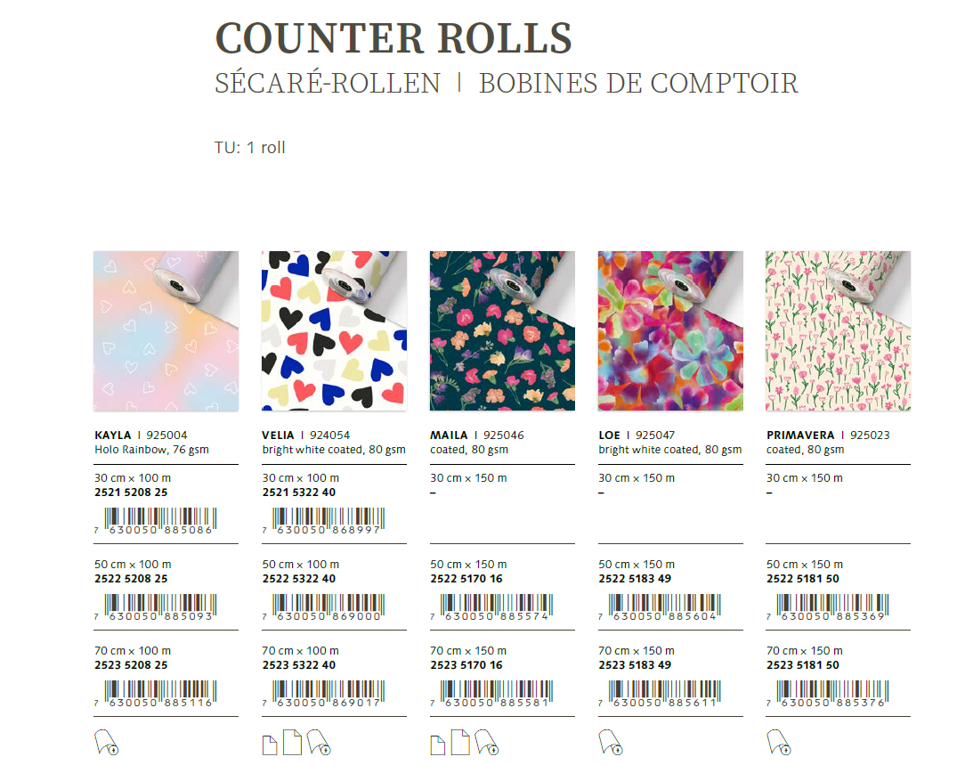 Sécaré-Rollen sind ideal zum abreissen ab einer Aufhängvorrichtung. Die Geschenkpapier-Rollen haben normalerweise eine Länge von 250 Meter. Es gibt 3 verschiedene Rollenbreiten.