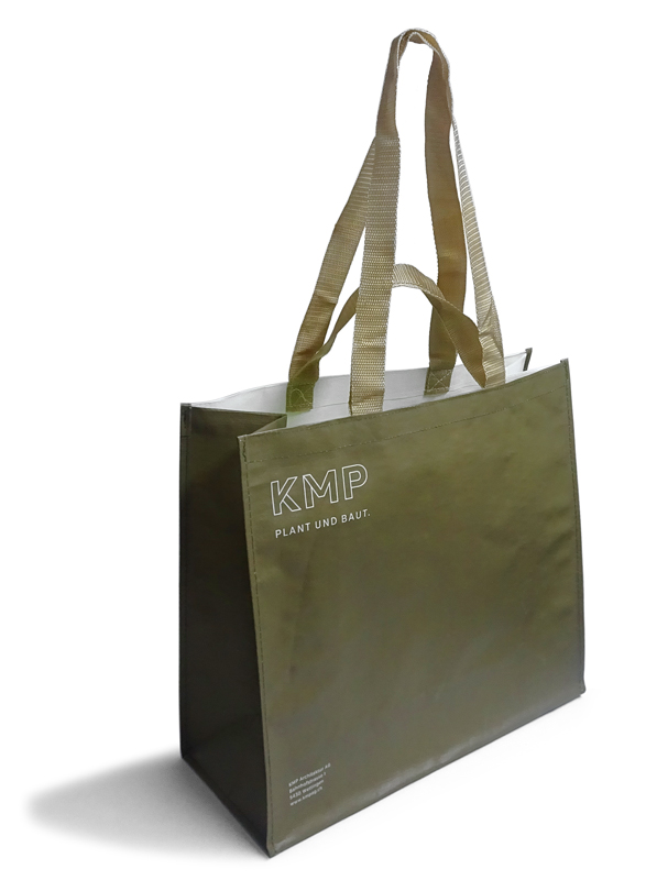 PP Tasche aus dem LagerprogrammDie stabile Tasche kann schon ab 150 Stück mit Ihrem Logo bedruckt werden.